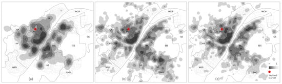 Kernel density analysis: (a) COVID-19 cases by Weibo data; (b) population density; and (c) the elderly population density generated by mobile phone data.