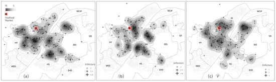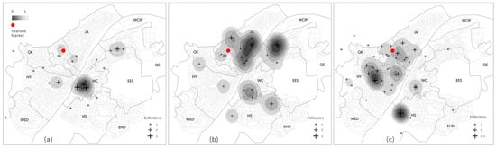 Spatial distribution of help seekers from December 20th, 2019 to January 22nd, 2020: (a) before January 18th, 2020; (b) from January 19th to 20th, 2020; and (c) from January 21st to 22nd, 2020.