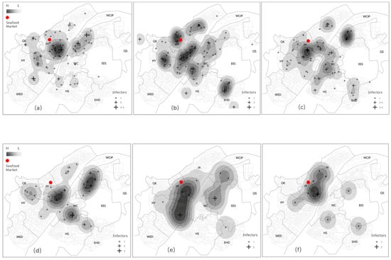 From January 29th, 2020 to February 3rd, 2020, it was the sub peak in several periods (Figure 14a–c). The distribution of cases was in an average trend in all regions, with the hotspots concentrated in Jiang’an, Jianghan, Wuchang, and Qingshan districts, being still basically within the initial range. The number of the core density regions decreased while the range of transmission further expanded from February 4th to February 7th, 2020 (Figure 14d,e). By February 10th, 2020, the number of patients had been trending to single digit, and the spatial distribution characteristics were no longer typical in terms of sampling coverage (Figure 14f).