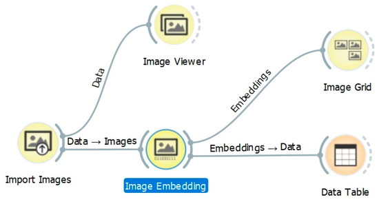The Image Analytics add-on is designed to use images for unsupervised machine learning. The add-on has five widgets: Import Images, Image Viewer, Image Embedding, Image Grid, and Save Image (in version 0.4.1). The process is designed as a visual workflow with a chain of widgets (Figure 1). The widgets from Image Analytics are indicated as yellow nodes in the workflow. The core widget is Image Embedding and offers several embedders, each trained for a specific task. Image Embedding offers six pre-trained artificial deep neural networks [21]: