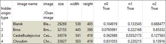 Table of enhanced output data with image descriptors (attributes n0, n1, n2 …) for each source image processed using the Image Analytics widget (only partial extract of descriptors).