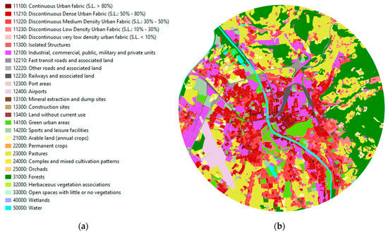 Example data: (a) categories of land use in Urban Atlas 2012; (b) circular extract of the city of Salzburg, source: [29], final validation 29 June 2018; circular extract – author’s work.