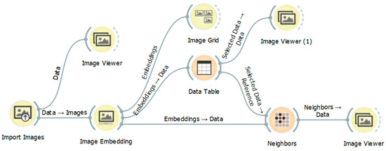 For processing in Orange, the same workflow used in preliminary testing was applied (Figure 4). In Section 2.3, the workflow was able to find the nearest neighbor pairs (triplets, etc.) of images; for example, map extracts in preliminary testing. This workflow’s advantage is that it may be used with any other data set in Orange, and it is therefore very effective. Only the working directory must be set to process new data in the Import Images widget. Subsequent widgets in the workflow calculate new data automatically. To process around 800 pictures of land use maps of cities, the software requires several minutes because the embedder sends data to a server containing the pre-trained neural network Painters. The image descriptors are then returned shortly after. Image descriptors is the matrix of 787 × 2048 cells where each row is descriptor for one picture.