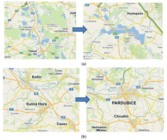 Two pairs with similar maps: (a) neighbor maps with water bodies; (b) neighbor maps with first and second class roads (extracts are author’s work from portal: https://mapy.cz, accessed 10 September 2019).
