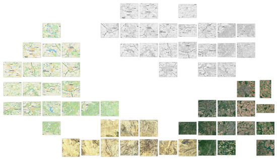 The next experiment attempted to work with four types of screenshot maps from the same map portal. This included historical maps, aerial maps, and base maps converted into black and white images. In total, the second test sample contained 65 maps of four types. The widget Image Grid shows a similarity grid (i.e., images with similar content were grouped with each other). The widget can be used to compare images and search for similarities or differences in the selected data instances. The resulting image grid for the 65 maps is shown in Figure 6. The result suggests that the four types of maps were automatically separated into four different clusters. The results of unsupervised learning by the Painters embedder once again demonstrated promising results in processing maps.