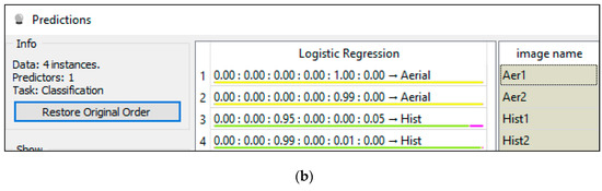 The final experiment in the preliminary testing attempted to predict the type of map according to known categories. Four more sample maps were prepared, consisting of two historical maps and two aerial maps. The Painter embedder calculated the feature descriptor for these four maps. The second Painter embedder in the workflow calculated the feature vector for the set of 65 maps according to category. Allocation to a category was achieved with the Logistic Regression and Prediction widgets, as indicated in the workflow (Figure 7a). The resulting allocation of new maps into categories was correct with a high degree of probability (Figure 7b). Two aerial maps were assigned to the aerial map category (probability 1 and 0.99) and two historical maps were assigned to the historical map category (probability 0.95 and 0.99).