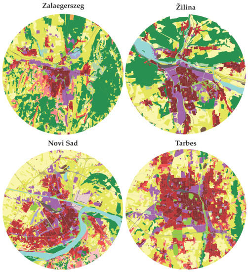 A high occurrence of discontinuous medium density urban fabric can be seen in opposition to a continuous urban fabric. This is typical of Western European cities, but not Eastern European cities (e.g., cities of Zalaegerszeg and Žilina). Forests exist in small isolated pockets. The land use pattern is a mosaic of various types. Salzburg (Figure 3) also approximates the third group. Neighbor cities can thus be explored by defining groups of similar cities according to the typical character of their land use arrangement.