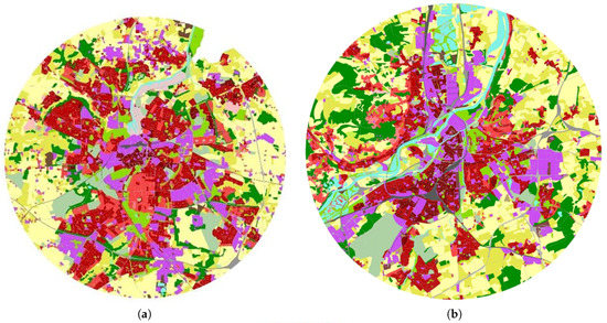 Figure 8 shows also shows another interesting pair: Novi Sad (Serbia) and Tarbes (France). In both cities, a rectangular array of patterns in the urban fabric dominates. Both cities have only a single, dominant center with a high-density urban fabric (historical center with old buildings). A discontinuous urban fabric (density 50–80%) covers a greater area than a continuous urban fabric. Forested areas are few or absent in the surroundings of these cities. Both cities are surrounded mainly by arable land and fields.