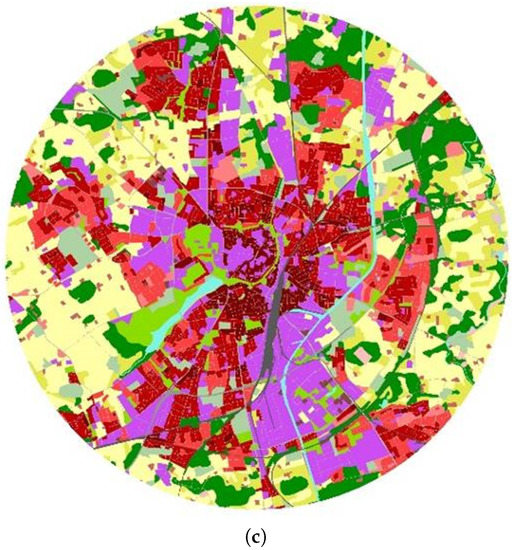 An interesting triplet of look-alike cities. (a) Odense; (b) Metz; (c) Münster. (Source: [29], Metz 16 December 2015, Münster 23 March 2018; circular extracts – author’s work).