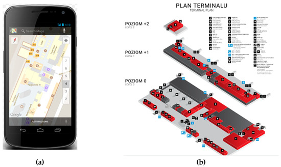 A simplified way of showing the third dimension on maps supporting navigation in buildings (a) Google Maps application (source: Engadget); (b) The map of the Wrocław airport presented on information kiosks [10]