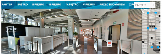 Makochon and Donatis show in the article [7], that existing technological solutions for creating indoor building models for navigation applications, such as Indoor Atlas, only allow for obtaining data for each floor separately. Building models are also used to manage real-world buildings or to play games. However, several restrictions can be seen, for example, in the virtual tour of the Centre for Innovation and Technology Transfer Management building located in Warsaw University of Technology campus (CZIiTT PW) (Figure 2). In this case, 2D presentations for each floor are also visible separately.