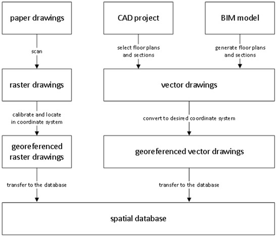 - Gotlib, D.; Karabin, M. Integration of Models of Building Interiors with Cadastral Data. Rep. Geodesy Geoinformatics 2017, 104, 91–102. [Google Scholar] [CrossRef]