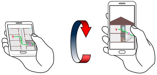 The only purpose of the prototype application is to simulate the 2D+ visualisation process. All input data are fictitious: information regarding the user’s location in the local coordinate system of the building, the direction of the device (in other words, the direction in which the user is moving), and the device’s orientation (vertical or horizontal, see Figure 6). Based on the data, the right floor plan (horizontal orientation of the device) or the corresponding vertical cross-section (vertical orientation of the device) is loaded.