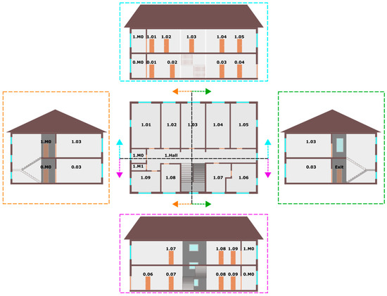 In the most straightforward approach, the navigation application can only use the main cross-sections of the building that correspond to their façades. Well-prepared architectural and construction documentation either contains or enables generating more sections, depending on the nature and complexity of the building. These cross-sections can be used in more advanced applications. In the most complex case, one may assume the use of cross-sections coinciding with the planes of most of the main walls of the building. The cross-section selection process can be aided by visibility analysis based on a visibility graph. Grasso et al., discussed this comprehensive topic in [33]. Another important direction of consideration is the use of automatic cross-section generation. In this solution, an approach analogous to the methods of automatic schematic map generation can be used [34]. There is a separate issue of determining which of the cross-sections available at a given moment of the navigation process is more useful to the user: whether it is the closest one or, for example, the cross-section showing the building’s façade. Figure 11 depicts the situation of selecting the closest section, based on the user’s position and the direction of their gaze.