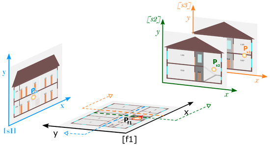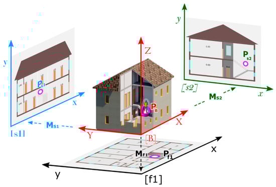 This approach, like the previous one, assumes that the data are stored in raster or vector forms as two-dimensional drawings in the database. In this case, the Mf1 (a matrix defining the method of transforming coordinates from the coordinate system of the building’s model [B] to the coordinate system of the floor plan [f1]) and Ms1 (a matrix determining the method of transforming coordinates from the coordinate system of the building’s model [B] to the coordinate system of the building’s cross-section [s1]) matrices are identity matrices.