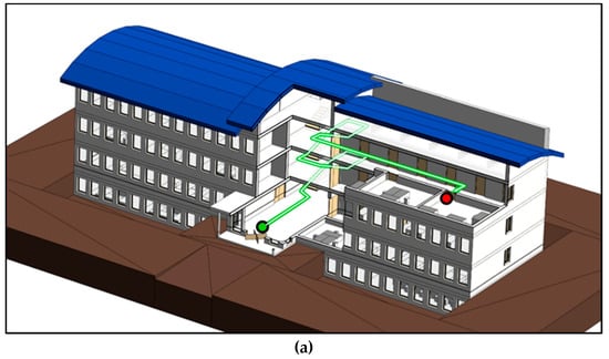 The concept of route visualisation: (a) an outlook presentation of the route on the whole building in 3D; (b) visualisation of the route on the floor plan in 2D; (c) and (d) visualisation of the route on the cross-sections; (e) the legend for the conceptual visualisation of the route in the cross-section.