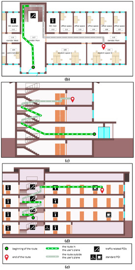 It is possible to infer some elements of the proposed concept of cartographic visualisation from Figure 5, Figure 7, and Figure 8. Figure 10 shows the method for visualising a route in a building: the part coming further or nearer in relation to the observer is drawn by an artificial “elevation of the route above the floor level.” The markings on the line with the arrowheads pointing down show the route approaching the observer; upwards to zooming out. The vertical cross-sections show the room numbers. It is suggested to create the distance between rooms and a given section by changing the label size (a room number) or by saturating the colour of the objects [31]. As the distance of the room from the section increases, the label size and the saturation of the room’s walls decrease. The authors abstained from using the graphic variable “saturation,” considering that this way of presenting information may prove unreadable to a mobile application user (a small screen, movement, et cetera). This approach is in accordance with the general principles of the mobile cartographic presentation presented in [32]. The correct use of graphic variables is shown in Figure 10b-–d, while reading difficulties may occur in the case shown in Figure 10a.