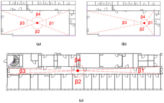 When adopting a somewhat more complex approach, the selection of the correct vertical cross-sections depends not only on the user’s position and the direction of their gaze but also on the shape of the room itself. One may consider the simplest situation when the user is near the centre of a room, in which the proportions of the length of the walls are close to 1:1 and certainly do not exceed 1:2 (Figure 12a). In this case, the angles between the directions of the user’s position to both corners of one wall marked as β1 ... β4 are not significantly different. When the user “gazes” perpendicularly to the wall or the direction of their gaze is tilted from the perpendicular direction by an angle not exceeding +/−45 degrees, it is best to show the section located in front of the user. The value of the critical angle should be smaller for rooms with more corners, which can be expressed by the formula: