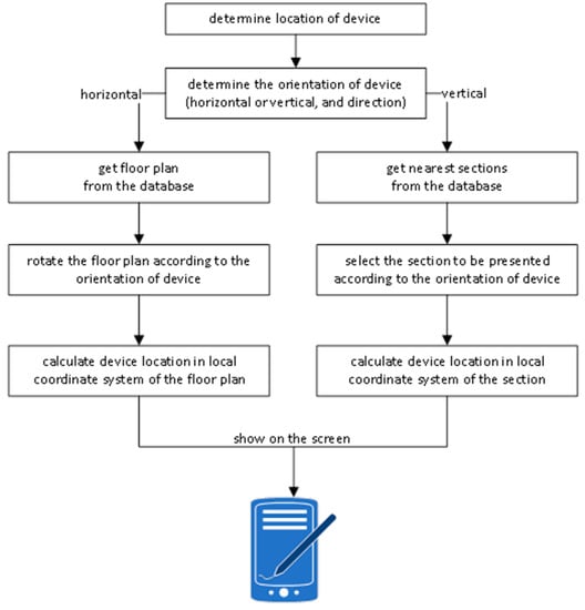 The development of the prototype required proposing a structure for the database, methods for obtaining data on the interior of buildings, and an algorithm for the operation of the navigation application, including an algorithm for selecting the vertical cross-sections to display by the user’s location and the room shape. For this purpose, the authors proposed utilizing a spatial database using PostgreSQL with the PostGIS extension. Floor plans were stored in the geodetic coordinate system, while raster and vector vertical cross-sections were stored in the local coordinate systems. Figure 13 shows the general algorithm for the 2D+ visualisation function in the prototype solution.