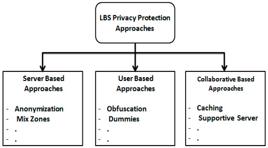 To address this problem and to protect the privacy of LBS users, researchers have proposed several approaches. The solutions were addressed from different perspectives, namely the server-side, user-side, and the interactive cooperation between both server-and user-sides. Figure 2 is a classification of LBS privacy protection approaches, where each category has its drawbacks.