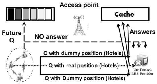 One of the most important cooperative ways in which LBS users can avoid dealing with TTPs is minimizing the connecting number with the LBS server [38,39,40]. The key idea relies on the cache, where the Responses of the Queries (RoQ) stored previously are exploited to answer future queries. Therefore, the LBS user tries to find the answer to his/her query in the cache, and if he/she finds his/her query answer in the cache, it is considered acceptable. Otherwise, the LBS user is forced to connect to the LBS server. However, the choice of connecting to the LBS server is still standing. This in turn means that the LBS user will be in a critical situation in case of tracking for a long time by the LBS server. Moreover, no strong trust basis can prevent users from turning to an attacker. Furthermore, the quality of the RoQ may be weak, leading to a poor system response performance.