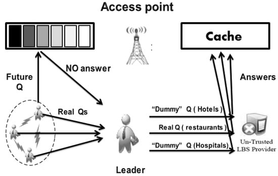 Focusing on cache-based approaches, a leader (that acts as a TTP) can decrease the connecting numbers to the LBS server and optimize the quality of the RoQ stored in the cache at the same time. Through building trust between LBS users and a Leader, all LBS users can be prevented from connecting to the LBS server. Implementing a leader (TTP), through which the queries of the LBS users are sent to the LBS server, means that the leader can protect his/her privacy without the need for dummies generation; real queries will be exploited as dummies on the leader side. Moreover, compared to the RoQ built on dummies, the responses of these exploited queries will be the actual results for what the LBS users are searching for. As a result, the cache will be filled with valuable information that contributes to increasing the probability of answering future queries. This in turn optimizes the response time of the system since it shortens the time of query manipulation due to the locality concept.