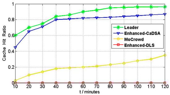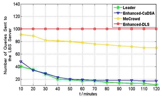 As is shown in Figure 14 below, the enhanced-DLS achieved zero values since it does not use a cache. For the other approaches, the cache hit ratio is enhanced during the time progress because of the cache. Enhanced-CaDSA presents better cache hit ratio values compared to the Mobile Crowd. This is because the dummy locations, generated to protect the privacy of the LBS user, use normalized distance, which in turn optimizes the quality of information stored in the cache. Moreover, the data freshness term will keep the most important information that is expected to be used to answer future queries. Furthermore, the cache contained in mobile devices of users cannot be compared to the storage of access points, which represents caches in Enhanced-CaDSA. Despite the good performance of Enhanced-CaDSA, the proposed approach provides better cache hit ratio values, where the Leader approach used a hundred POIs in the system compared to one POI used in the enhanced-CaDSA. The reason behind this is that the proposed approach depends on the real or actual positions to generate dummies sent to the LBS server. This means the leader approach uses the precise locations of users and exploits their actual positions, which are likely located to search for POIs. In everyday life, compared to the selection of dummies using normalized distances, exploiting actual positions as dummies has more of an impact on the quality of information stored in the cache. The answers to the dummy queries lead to a higher probability of existing future query answers in the cache.