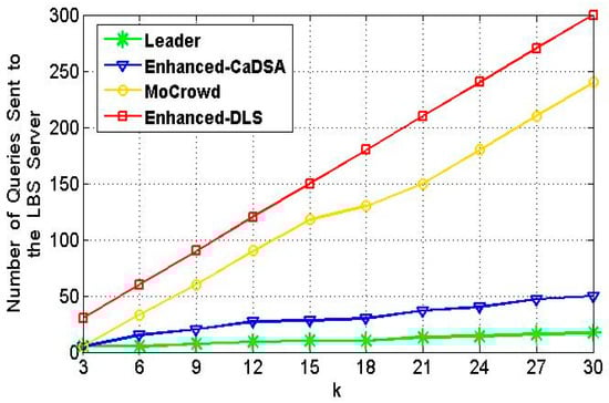 Figure 12 supports the results obtained in the first aspect (i.e., the time progress), where the number of queries sent to the LBS server in enhanced-DLS increases linearly as increases, and again enhanced-DLS gives the worst results among the other approaches. Enhanced-CaDSA performs better than both enhanced-DLS and Mobile Crowd due to its good cache design. Compared to enhanced-CaDSA, the proposed approach gives better results. Each real query, which acts as a “dummy” in the proposed approach, maps several generated dummies in enhanced-CaDSA. Consequently, the number of queries sent to the LBS server, to achieve the concept, will obviously be less.
