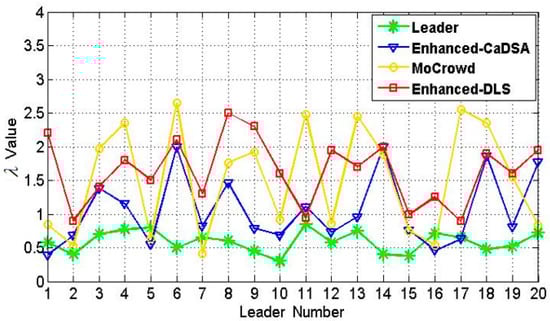 Because the proposed new privacy metric relates to the Leaders involved in the system, we evaluated the closeness of the attacker (LBS server or his maintainer) to the moment of his attack launch against the Leaders in the time progress. In addition, because the k-anonymity concept is achieved automatically in the proposed approach, is set to 6 for each cluster (i.e., at any moment, the Leader will receive five real queries as dummies in addition to the real query related to the Leader himself to be sent to the LBS server). Under threat of a mixture of inferences attacks (i.e., heterogeneous attack, query sampling attack, and location semantic attack), a snapshot at is taken. Twenty leaders’ situations are evaluated taking into account a threshold that equals , at which the Leader is considered to be in dangerous conditions of attack by the LBS server. In order to make an identical comparison among the approaches, the same number of LBS users (i.e., 20) are randomly selected from each of the three previous approaches to be evaluated under the same threshold condition. It should be mentioned that the threat model provided in [46] is used as the basis of our approach, where every 3 min a different kind of inference attack is periodically applied. Figure 13 shows the results. It is taken into account that each LBS user involved in enhanced-DLS, Mobile Crowd, and enhanced-CaDSA is considered a leader. The comparison of the dangerous status of leaders is summarized in Table 1.