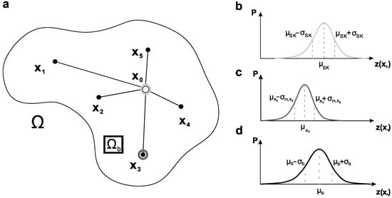 Schematic of the uncertainty components integrated into a predictive model of rock properties. (a) Illustration of an interpolation process using neighboring points with known values to predict the unknown value at . (b–d) Schematic of the local probability density functions (PDFs) in form of a Gaussian distribution defined by and for the estimated kriging error variance at (b), the observed measurement error at the point (c) and the observed variance in a subset of (d).