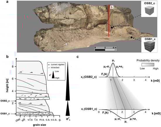 (a) Photogrammetric model of the investigated sandstone quarry. The outcrop is compartmentalized by two scissor faults and consists of two lacustrine-deltaic Bouma sequences []. (b) Sedimentological 1-D section of the sedimentary architecture observed in the outcrop. The Bouma sequence provides an erosive base. One sequence is characterized by a fining-upward trend and consists of intraclasts-rich massive sandstones at the base and trough cross-bedded and ripple cross-bedded sandstones towards top []. (c) Spatial interpolation of a PDF exemplary illustrated with both theoretical Gaussian distributions derived from the measurements of OSB1_c and OSB2_c.