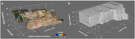 (a) Photogrammetric model of the investigated sandstone quarry in Obersulzbach, Germany. Sample locations are displayed as spheres, whose color indicates the observed permeability value at the sample locations. (b) Hexahedral non-orthogonal mesh of the investigated outcrop generated by an IDW interpolation using the nodes of the photogrammetric model as constraints.