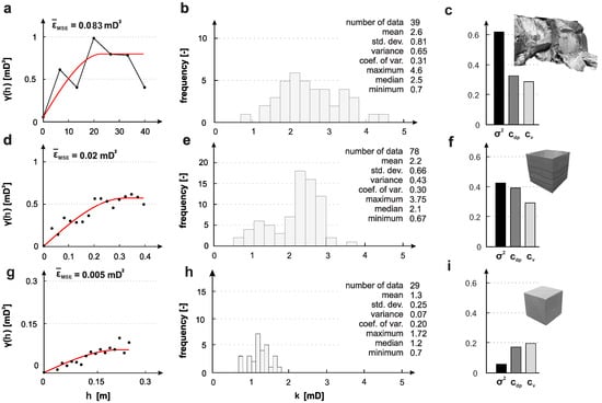 Empirical variogram and variogram model, empirical histogram, and heterogeneity-indexes derived from the k measurements for the outcrop (a–c), and the rock cubes OSB1_c (d–f) and OSB2_c (g–i). A scale-effect is observable in the heterogeneity-indicating coefficient of variation, the Dykstra–Parson coefficient and the sample variance. All variogram models are described by a spherical model with nugget effect. The variogram model for (a) is described by n = 0.05 mD, a = 23 m and b = 0.75 mD with n as nugget, a as range, and b as sill. The model for (d) is described by n = 0 mD, a = 0.3 m and b = 0.58 mD while the model of (g) is described by n = 0.005 mD, a = 0.18 m and b = 0.08 mD.