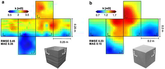 Spatial distribution of the intrinsic permeability in the rock cubes OSB1_c (a) [] and OSB2_c (b) interpolated using the SK method.