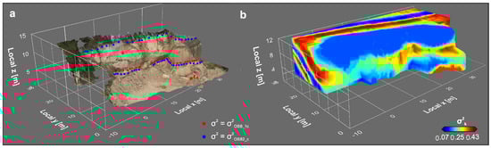 (a) Mapping of the local variance with regard to the observed geological structure. The highest variance is indicated by red spheres whereas the lowest variance is indicated by blue ones. The variance is derived from the rock cube measurements of OSB1_c—representing the most heterogeneous lithology at the bottom of the Bouma sequences (red)—and OSB2_c—likewise representing the most homogeneous lithology at the top of the Bouma sequences (blue). (b) The 3-D local variance model (LVM) representing the locally observable variance, which is constrained by the mappings shown in (a).