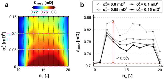 Results of the linear integer programming optimization using the marked sampling points. The interpolation error is minimized using the inequality constraints given in Equation (22). (a) RMSE response surface with regard to the incorporated measurement error variance and the maximum number of neighbors using a leave-one-out cross-validation. (b) Cross sections through the response surface of (a).
