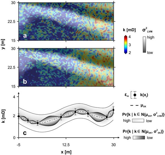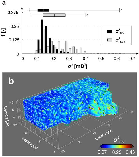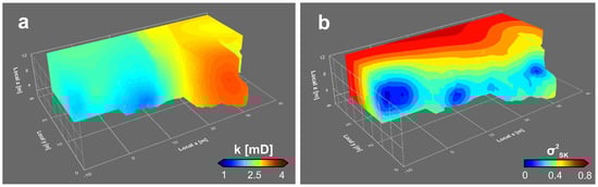 The measurements from the outcrop region show a of 0.28 and a of 0.31. The histogram indicates a normal distribution of k ranging from 0.7 mD to 4.6 mD (Figure 5b). A two-sided Kolmogorov–Smirnov test [], which is based on an implementation of Simard and Ecuyer [], confirmed the hypothesis that all samples come from a normal distribution. The application of Tukey’s outlier detection method [] reveals no statistical outliers in the sample. By applying the classification scheme of Corbett and Jensen [], the sample can be classified as being very homogeneous.