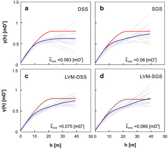 The minimum requirement for geostatistical simulations is their ability to reproduce the original data, the global summary statistics and the global variogram model [,]. Erdogic fluctuations refer to the discrepancy between the model parameters and the realizations’ statistics []. In the case of the variogram model, the discrepancy of a realization to the variogram model is related to the limitation of the integrated constraints to a limited neighborhood. This, in fact, leads to higher errors at far ranges within the simulation. In this study, we quantified the ergodic fluctuation of a realization by estimating the average MSE between the experimental semivariogram and the variogram model. If a realization’s discrepancy among the experimental variogram and variogram model does not exceed the original values discrepancy, the variogram reproduction is said to be within the range of ergodic fluctuations.