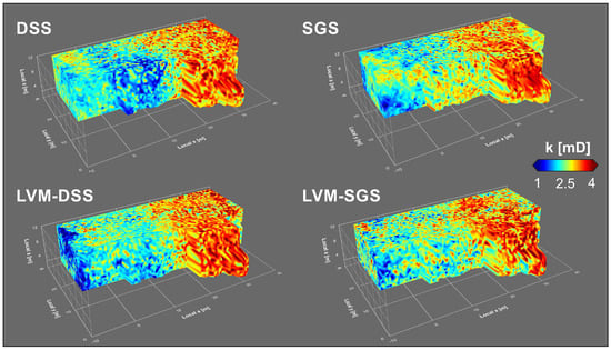 In contrast to conventional interpolation techniques, stochastic simulations aim to reproduce the variance and the histogram observed in the global data [,]. Based on either being constrained or not, stochastic simulations split up into unconditional and conditional simulations []. Unconditional Monte Carlo-based simulations reproduce the original histogram without spatial constraints. The realizations produced by those methods, however, are regularly far away from representing the true spatial distribution and constitute “most likely” cases at the best. Conditional simulations, in contrast, aim to reproduce the original property distribution by means of discretely sampled points together with spatial characteristics such as the observed variogram model [].