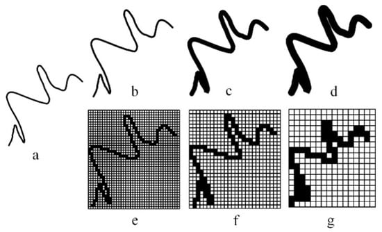 Consistency evaluation of map LoD can be conducted at both the semantic and representational levels of a geometric graph. Touya et al. [8] divided building polygons in OpenStreetMap into four hierarchy levels (single building, street, city, and country) according to different LoD hierarchies under different scales. As another example, considering features representing forest areas and single buildings, these features belong to different semantic levels: a forest area that has few vertices and overlaps several buildings should be considered inconsistent at the semantic level [9,10]. The most direct method of measuring the LoD of a geometric element is to calculate the shortest distance between adjacent points belonging to the feature. For example, Ai [11] measured the LoD of a point cluster using a point-oriented Delaunay triangle. For a curve or polygon feature, the length of the shortest side of the feature can be used as the minimum detail parameter for cartographic representation [12]. For the sake of clarity and readability, curve symbols on a map have a minimum perceptible width. The larger the scale, the larger the ground distance to which the line width corresponds. When the scale is less than a certain threshold value, neighboring parts of the feature will aggregate. This means that the curve symbol width of curves at aggregation can be used as a parameter for LoD assessment [12,13]. This method is called incremental curve detail detection. Another method involves rasterizing curve features using incremental grid widths. When the grid width is greater than a threshold value, the part of the curve that does not coalesce at smaller grid widths appears to aggregate. The grid size which is equal to the threshold value is used to define the LoD of a curve [14]. Figure 1 shows the LoD detection processes employed by the aforementioned methods. In Figure 1b, the curve detail is clear when the symbol width is 1m; however, the symbol aggregates once and twice when its width is 2 m (Figure 1c) and 3.5 m (Figure 1d), respectively. Figure 1e–g show the same curve rasterized with different grid widths. Results obtained by the increment grid width method are consistent with those obtained by the increment symbol width method. The LoD parameter of a feature can be measured by the threshold width (symbol width or grid width) where parts of the feature conglomerate together.