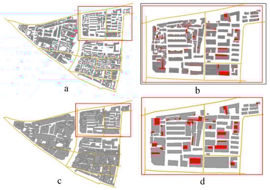 The experimental results are the same as those of the natural geographical features, and the data obtained in Table 6 prove that the method has a good discrimination effect on the inconsistency of building scale in the map. For the original building map, the nominal scale is 1:10,000, and the calculated scale is 1:9339; these are close to each other. When some buildings from the large-scale map are mixed into the original map, the actual scale of the map is increased from 1:9339 to about 1:2600, resulting in an inconsistent map scale.
