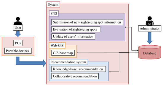 Against the above backdrop, the present study aims to develop a sightseeing spot recommendation system that can efficiently and usefully support tourists, taking their visiting frequencies into account. Regarding the system developed in the present study, efficiency is related to the provision of relevant sightseeing information to tourists using the internet, and usefulness is related to the recommendation of sightseeing spots according to tourist preferences and visiting frequencies. This system is designed and developed by integrating social networking service (SNS), Web-geographic information systems (GIS) and recommendation system (Section 3 and Section 4). SNS is used to gather, accumulate, evaluate and share sightseeing information. Web-GIS is used to visualize the sightseeing information on digital maps. The recommendation system is used to recommend sightseeing spots to users by taking the difference in the visiting frequencies into account. Additionally, the system will be used by various people from both inside and outside the operation target area during the operation period (Section 5), and improvement strategies will be submitted after the issues are identified by evaluating the system through a web questionnaire survey to users and an access analysis (Section 6).