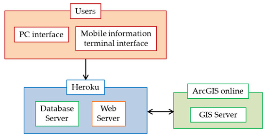 This system is operated using the Web server, database server and the GIS server. The system operating environment is as shown in Figure 2. Heroku, which is a PaaS provided by the Salesforce company, was used for both the Web server and the database server. ArcGIS Online, which is provided by the ESRI, was used for the GIS server. Additionally, the web application developed with the system was implemented using PHP and JavaScript.