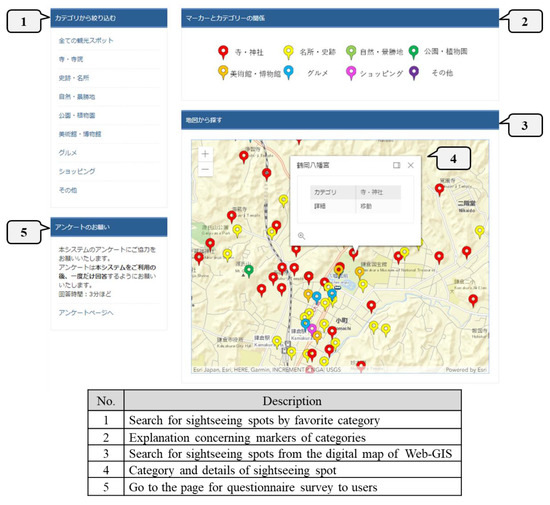 This system will implement unique functions for users, which will be mentioned below, in response to the purpose of the present study, as mention in Section 1. In order to implement these several unique functions, the system was developed by integrating plural systems into a single system. Additionally, the system was operated targeting Japanese people and those who can understand Japanese, while selecting Kamakura City, Japan as the operation target area. Therefore, all websites included in the system are written in Japanese with English notations.