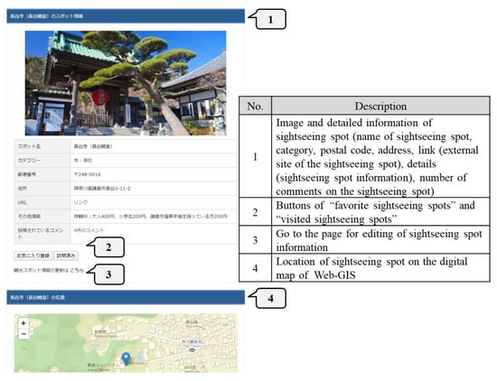 Users are transferred to the page for the viewing function of sightseeing spot information (Figure 3) from the “Kamakura area map” in the menu of the top page. This page allows users to search for sightseeing spots using “search from map” or “search by category”. When using “search from map”, a popup including the “name of sightseeing spot”, “category” and “link to the page for the detailed information of sightseeing spot (Figure 4)” will be displayed, by clicking onto the markers on the digital map. Additionally, the markers are color-coded according to category. On the other hand, when using “search by category”, sightseeing spots will be displayed in a list according to category. Users are transferred to the page for the detailed information of sightseeing spots by selecting a sightseeing spot from the list. Additionally, users who have created their own account and log in to the system can register their “favorite sightseeing spots” and “visited sightseeing spots”, by clicking onto the buttons of “register favorites” and “register past visits” from the list.
