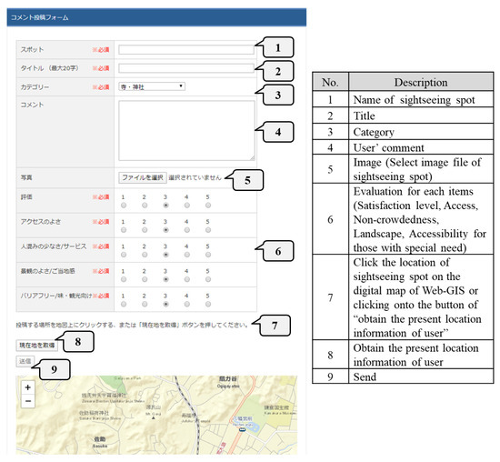 Users are transferred to the page for the submitting function of sightseeing spots (Figure 5) from the “submitting function” in the menu of the top page. In this page, information on a location can be submitted by entering the “name of sightseeing spot”, “title”, “category”, “comment”, “image” and “evaluation for each item”, and clicking onto the location on the digital map or by acquiring the present location information. For each evaluation item, five items including the “satisfaction level”, “access”, “non-crowdedness”, “landscape”, and “accessibility for those with special need” must be evaluated on a scale of 1 to 5. Regarding the scale, “5” means the best and “1” means the worst. Additionally, in the page for this function, users can be transferred to the list and map of submitted information. Users can visit the page for the submitted information list from the page for the submitting function of sightseeing spots as well as the top page. This page displays the “title”, “name of sightseeing spot”, “submitter”, “submitting date and time” and “image”. Users can go to the page for the detailed information of sightseeing spot, by selecting one of the submitted information.