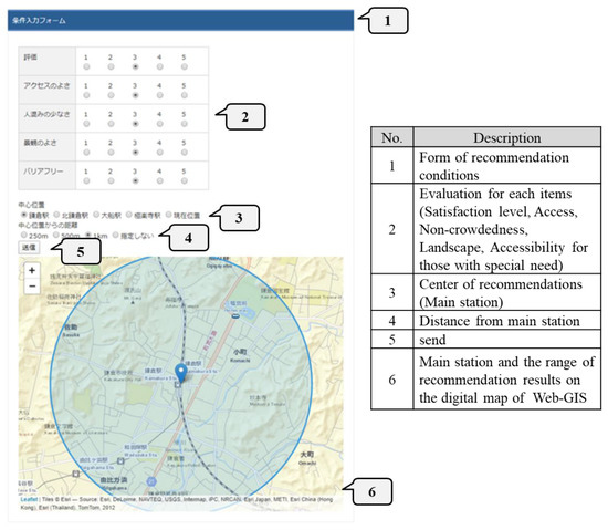 Users are transferred to the page for the recommendation function of the sightseeing spots adopting knowledge-based recommendations (Figure 6) from the “recommendation conditions” in the menu of the top page. By clicking onto the button of “send” after evaluating each items for sightseeing spots on a scale of 1 to 5, and selecting the range of recommendation results from “main station” and “distance (250m, 500m, 1km, or not specified) from the mains station”, users can go to the page for the recommendation results. The center of recommendations can be set as users’ present locations by using their present location information. Additionally, users can be transferred to the recommendation function of sightseeing spots adopting collaborative recommendations from the “recommended spots” in the menu of the top page. Sightseeing spots are recommended in the same way as the recommendation function of the sightseeing spots adopting knowledge-based recommendations.