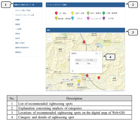 Users can go to the page for the recommendation results (Figure 7) by clicking onto the button of “send” on the pages of “recommendation conditions” and “recommended spots”. The page for the recommendation results displays a list of sightseeing spots (up to 10) that were recommended as well as the map with the locations. A popup containing the “name of sightseeing spot”, “category”, and the “link to the page for the detailed information of sightseeing spot” can be displayed, by clicking onto the markers on the digital map. These markers are color-coded according to category. The list of recommended sightseeing spots and the links in the popups lead to the link to the page for the detailed information of sightseeing spot.
