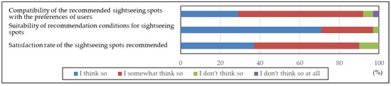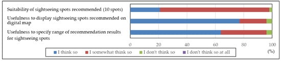 The evaluation results concerning the recommendation function of sightseeing spots adopting knowledge-based recommendations are shown in Figure 9. As mentioned in Section 6.1, when using this function, users must enter their recommendation conditions for sightseeing spots. The function was used by 72% of those who responded to the questionnaire survey. Regarding the compatibility of the recommended sightseeing spots with the preferences of users, 92% of those who used the function answered “I think so” or “I somewhat think so”. For the suitability of recommendation conditions for sightseeing spots, 97% answered “I think so” or “I somewhat think so”. Additionally, for the satisfaction rate of the sightseeing spots recommended, 90% answered “I think so” or “I somewhat think so”.