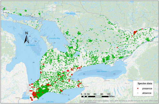 The species data used in this research were collected from 2006 to 2012 by the Canadian Food Inspection Agency (CFIA) [23]. The majority of the samples were obtained via green prism traps and visual surveys, with a lower proportion of samples obtained via branch sampling. Prism traps and visual surveys indicate whether trees are infected, whereas branch sampling provides the specific number of detected EAB beetles and is also more costly and labor intensive. Sampling was conducted in specific areas where the EAB could potentially have been introduced through human activities such as areas with visible Ash species decline, urban centers, provincial parks, campgrounds, rest stops along major transportation corridors, and Ash nursery stocks. In terms of the general shift of survey locations from one year to the next, each time EAB presence was confirmed within a county in the study area since 2004, the county was declared regulated and sampling would not be carried out in subsequent years within the same county. An overview of the EAB presence and absence points based on these data is displayed in Figure 1 and the yearly summary of presence and absence points is provided in Table 1.